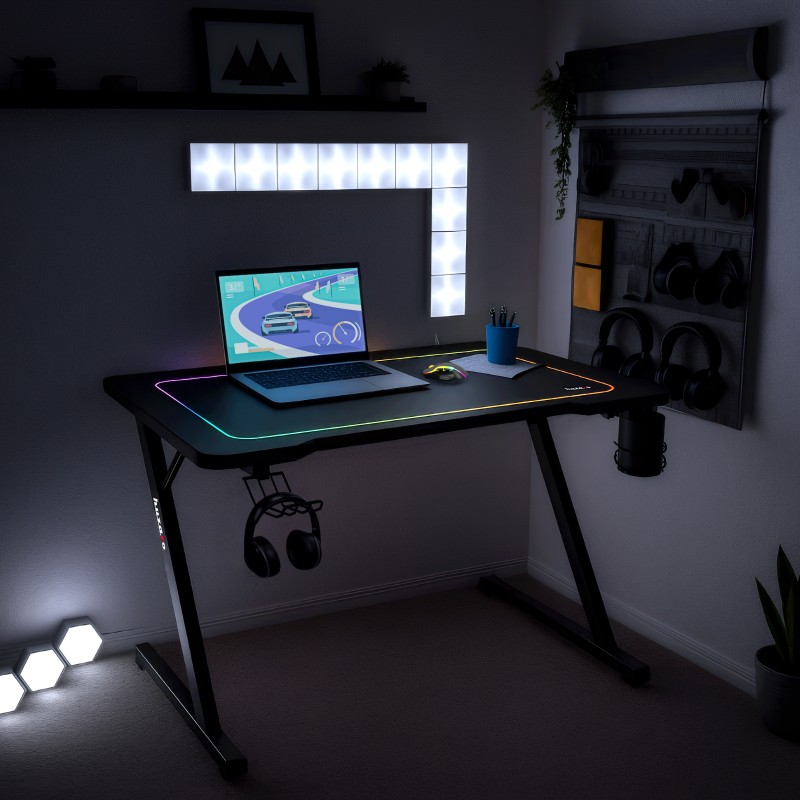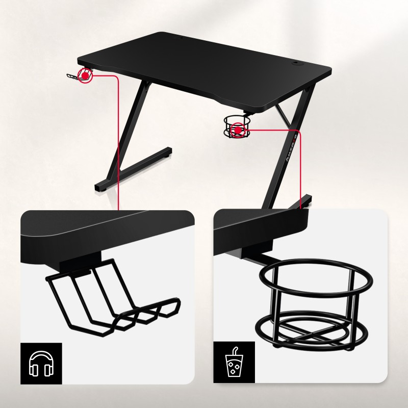 Biurko, które idealnie wpasuje się nawet w niewielką przestrzeń. Praktyczne w użytkowaniu, ale z gamingowym charakterem i wyjątkowym designem. Wytrzymały blat mimo kompaktowych rozmiarów jest bardzo przestronny i pomieści wszystkie niezbędne rzeczy. Biurko opiera się na metalowym stelażu, który zapewnia stabilność nawet podczas intensywnego użytkowania.
